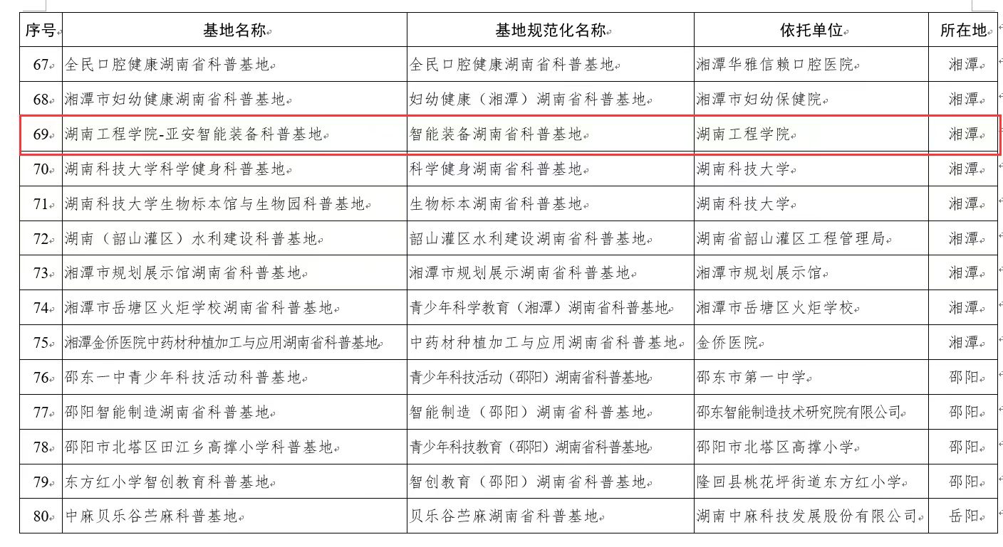 5月23日,湖南省科技厅公布湖南省省级科学技术普及基地备案、培育及取消名单,beat365英国官方网站王高升老师牵头申报的“湖南工程学院亚安智能装备科普教育基地”成功备案“智能装备湖南省科普基地”,成为beat365官网首个省级科学技术科普基地。