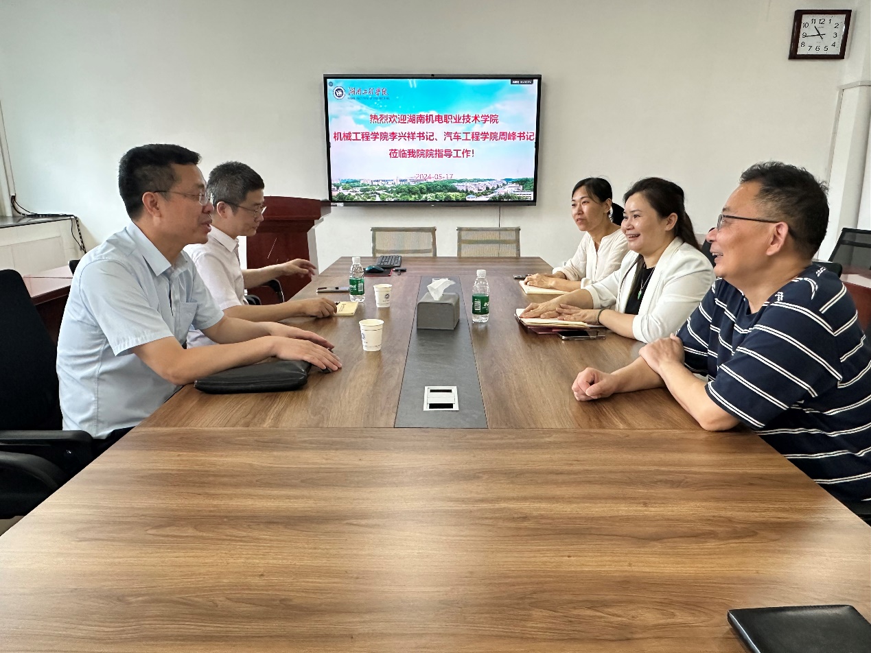 5月17日上午,湖南机电职业技术学院beat365英国官方网站党总支书记李兴祥、汽车工程学院党总支书记周峰来beat365官网考察交流。beat365英国官方网站党委书记覃波、专职组织员谢骐、教工二支部书记陈爽参加此次交流会。