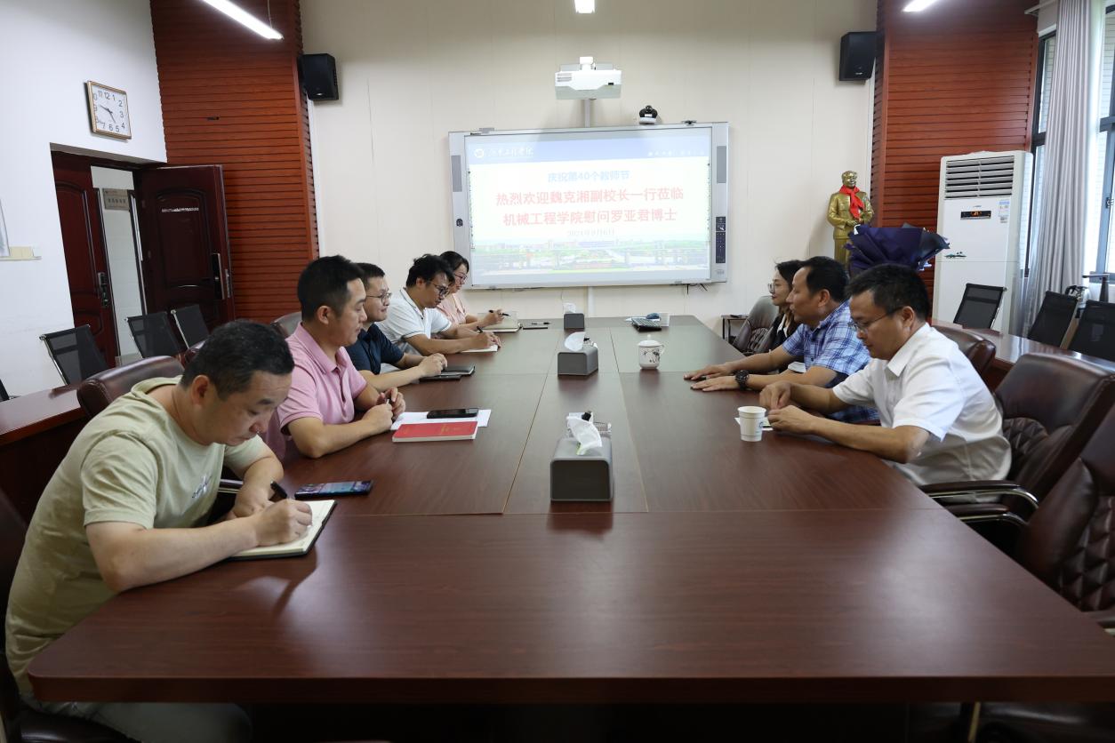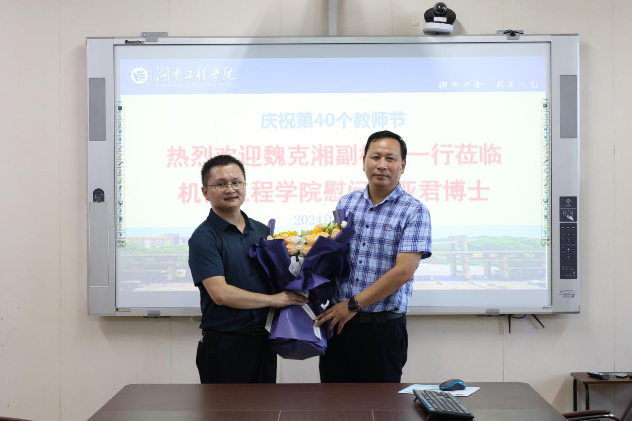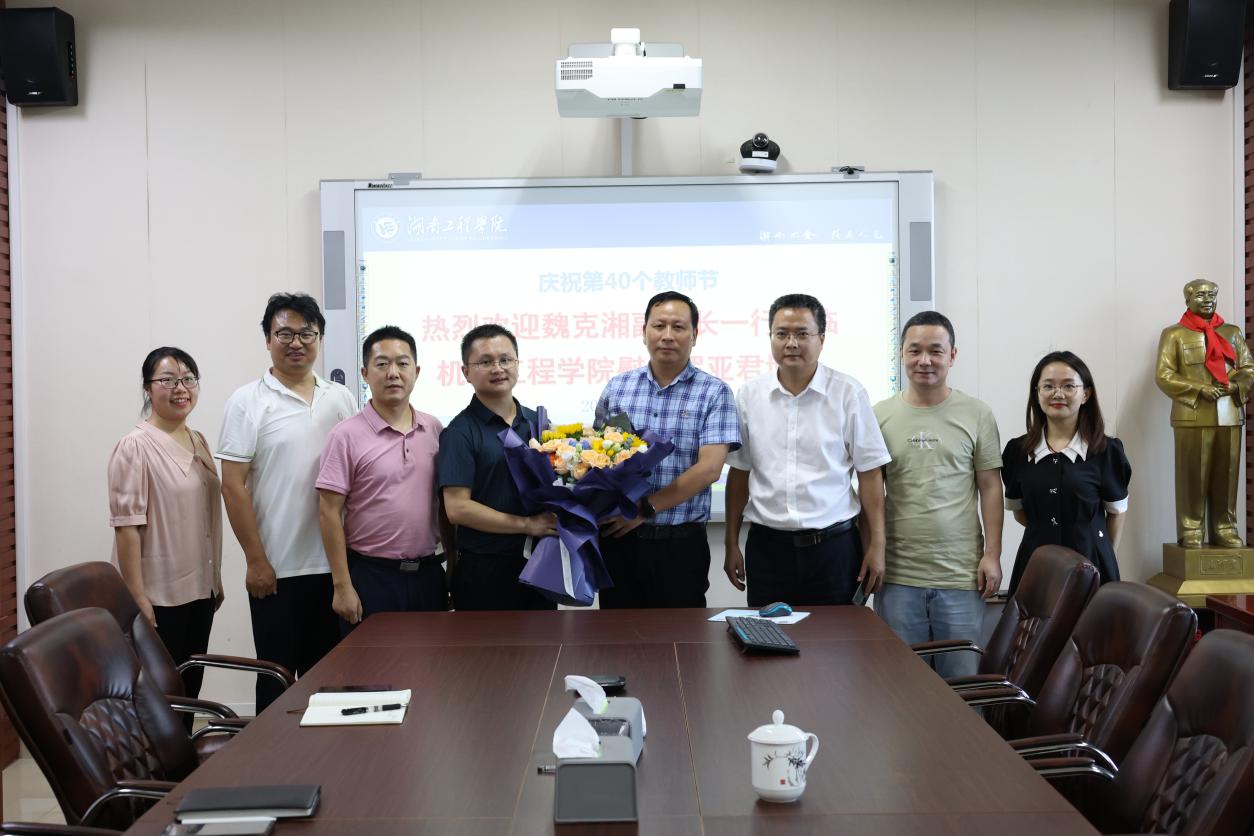 在第40个教师节来临之际,9月6日下午,校党委委员、副校长魏克湘带队来beat365官网走访慰问,代表学校向教师代表罗亚君博士及学院全体教师致以节日的祝福和诚挚的问候,科技管理处处长张细政陪同走访。beat365官网全体院领导参加。