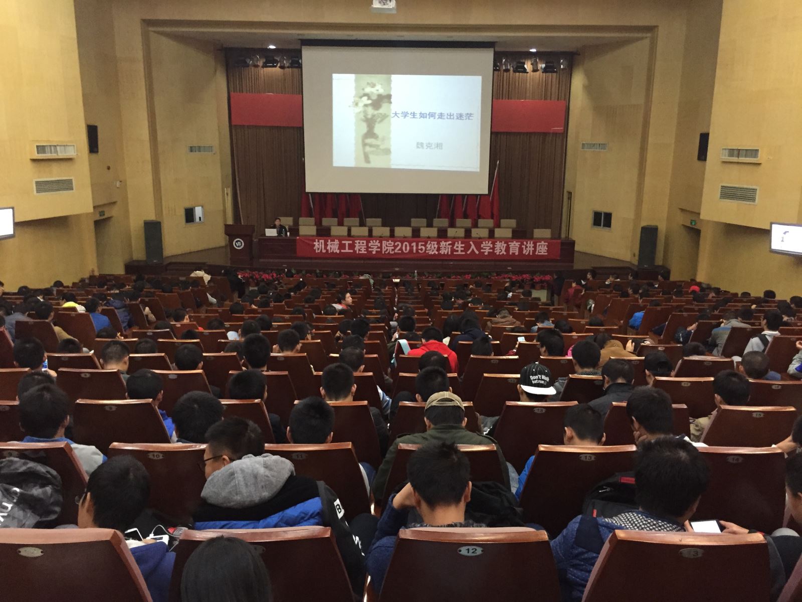 11月19日晚,beat365英国官方网站院长魏克湘在主校区一报告厅为2015级全体机械新生主讲了“大学生如何走出迷茫”教育讲座。院党总书记谢骐、学办部分老师及全体新生参加讲座。