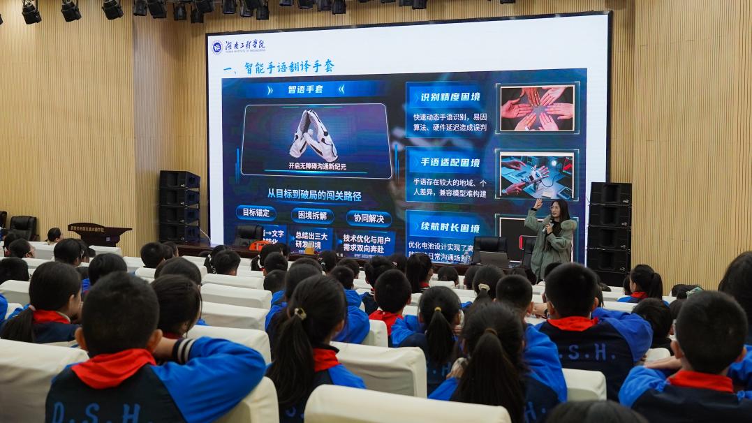 “原来走路也能发电!”近日,随着滴水湖学校多功能厅里一阵惊呼,湖南工程学院新能源与绿色低碳科普基地、智能装备湖南省科普基地和智创实验室团队携“挑战杯”全国大学生课外学术科技作品竞赛主体赛特等奖的队伍,把顶级赛事成果拆成“游戏包”,先后送进滴水湖学校和湖湘幼儿园,让不同年龄段的孩子在同一天遇见“未来科技”。