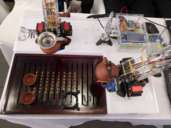 此次获得一等奖的作品是一款全自动智能家用泡茶机器人,主体由两套机械臂组成,分为泡茶机械臂和倒茶机械臂,两套机械臂固定在底座上,底座上还装有水龙头。使用者可通过喊一声“请泡茶”或者点击屏幕上开始按钮,泡茶机器人就会开始泡茶,整个泡茶过程全自动化。