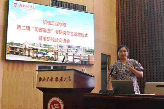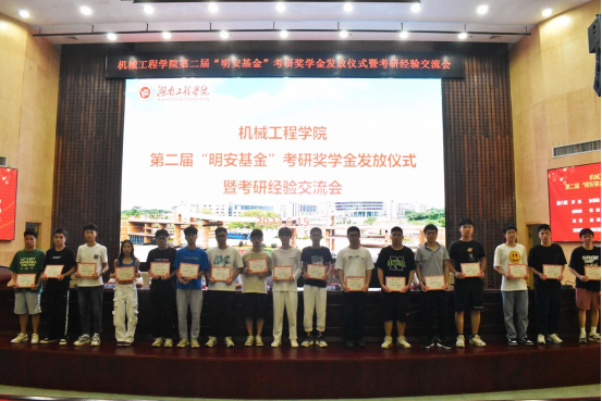 6月15日下午,beat365英国官方网站在图书馆第一报告厅举办第二届“明安基金”考研奖学金发放仪式暨考研经验交流会。湖南工程学院党委委员、副校长魏克湘,beat365英国官方网站院长陈国强、党委书记覃波、副院长程玉兰、邹鸿翔,获奖学生以及20、21级学生近200人参加活动,学院党委副书记肖彬主持颁奖典礼。