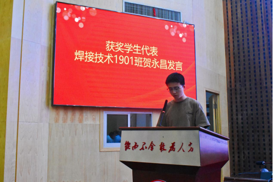 程玉兰宣读表彰决定并向92名考取研究生的2023届毕业生表达祝贺。获奖学生代表焊接技术1901班贺永昌发言中,代表全体获奖学生感谢校友的关心和鼓励,感谢老师的培养、指导和帮助。