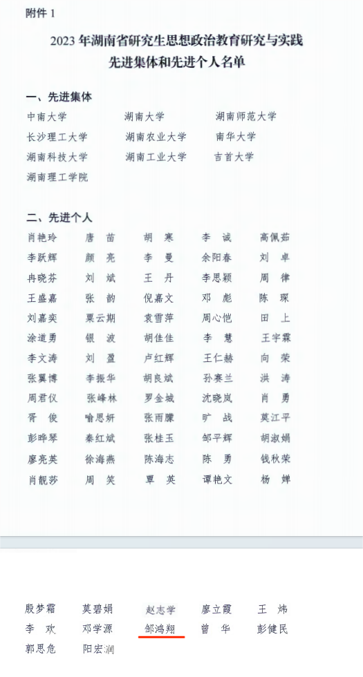 近日,湖南省思想政治教育研究会研究生工作专业委员会公布2023年湖南省研究生思想政治教育研究与实践先进集体和先进个人、优秀论文和案例,beat365官网副院长邹鸿翔博士获评2023年湖南省研究生思想政治教育研究与实践先进个人。