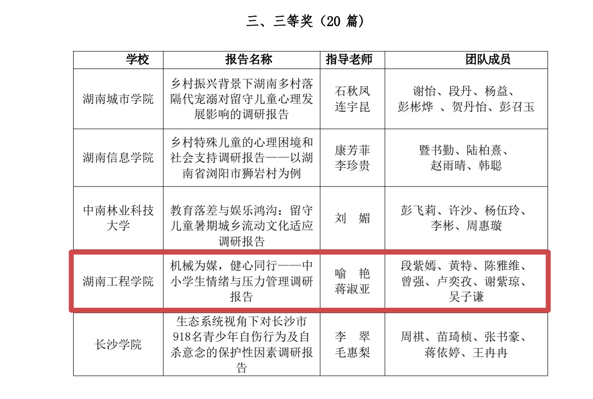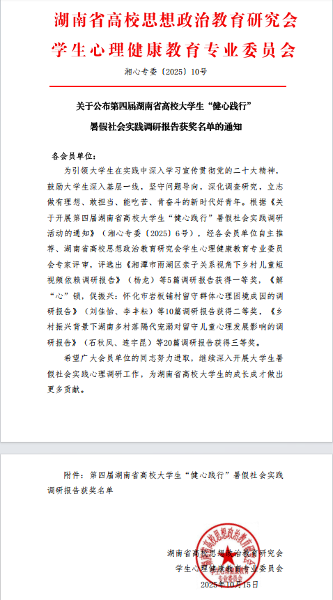 近日,第四届湖南省高校“健心践行”暑期社会实践调研报告评选结果公布。beat365英国官方网站提交的《机械为媒,健心同行——中小学生情绪与压力管理调研报告》荣获三等奖。