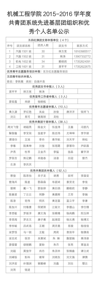 根据学院《评选机械 工程学院2015-2016学年度共青团系统先进基层团组织和优秀个人的条例》精神及beat365官网的有关文件要求,本着公开、公正、公平、透明的原则,beat365官网 2015-2016学年度共青团系统先进基层团组织和优秀个人的工作已评选结束,现将关于beat365官网2015-2016学年度共青团系统先进基层团组织和优秀个人评审名单公示如下,公示期为2017年5月4日—5月7日,请广大师生监督。