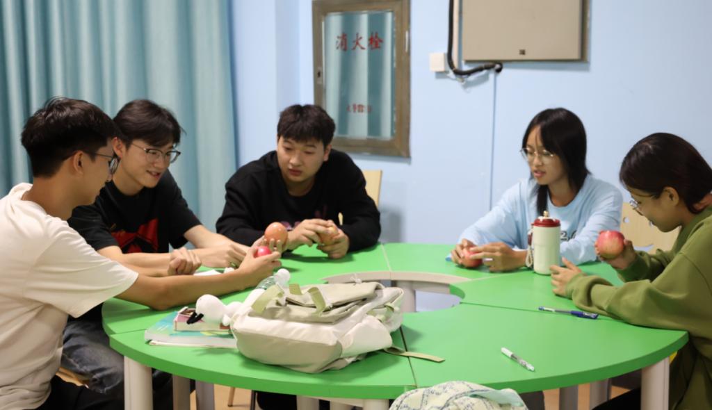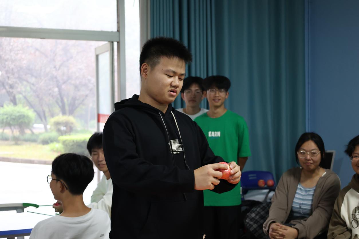 活动伊始,喻艳向学生介绍了本次活动的目的和意义。活动以热身活动“大风吹” 拉开帷幕,学生积极互动,现场氛围变得轻松愉悦。学生随机分成5组,参加“名字滚雪球”小游戏,进一步促进学生间的了解和互动。之后的主体活动“我的苹果”中,各组学生运用视觉、触觉、嗅觉细致观察与感受苹果的特征,并分享自己的体验和感受。“苹果就像我们每个人,都是独一无二的。”“多亏了这个苹果的缺陷部分让我闭着眼睛也可以迅速找到它,其实缺点有时候也可以成为优点。”通过个人探索和小组分享,学生认识到个体的独特性,学会接纳自己和欣赏他人。在“进入大学五个最”和“大学生活拼图”两个纸笔练习活动中,学生们整理进入大学后的感受并学会规划自己的大学生活,成员间相互讨论、碰撞思想,对未来有了更清晰的认识,从而尽快适应大学生活。“很特别” ,“轻松” ,“我从队员的分享中学习到很多”,“我要带领班级同学一起开展这个活动”,本次活动在全体成员分享参与团体活动感悟中结束。