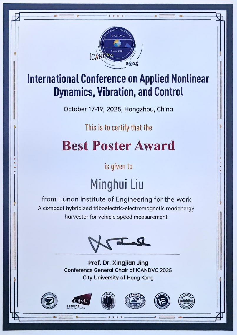 近日,2025年国际应用非线性动力学、振动与控制会议(ICANDVC-2025)在杭州隆重举行。beat365官网刘胜副教授指导的硕士研究生刘明惠同学凭借其出色的研究成果,荣获会议“最佳海报奖”。