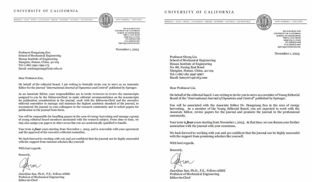 《International Journal of Dynamics and Control》是动力学、振动与控制领域具有重要影响力的国际期刊,致力于发表该领域前沿研究和工程应用的重要成果。两位教师受邀担任期刊学术职务,不仅是对其个人学术水平和声誉的肯定,更将为beat365官网动力学与控制研究领域搭建更广阔的国际学术对话平台,助力学院精准对接国际前沿方向,深化与海外高水平团队的合作,推动学科成果走向国际舞台。